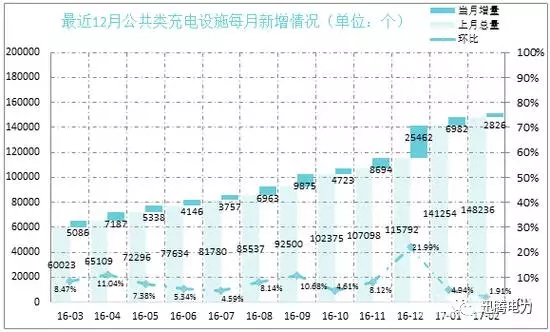 據了解,截至2017年2月,中國電動汽車充電基礎設施促進聯盟內成員單位總計上報公共類充電樁151062個,其中交流充電樁54919個、直流充電樁38490個、交直流一體充電樁57653個,2017年2月較2017年1月新增公共類充電樁2826個。從2016年3月到2017年2月,月均新增公共類充電設施約7587個,2017年2月同比增長151.7%。實際每月新增公共類充電設施及環比數據如下圖所示: