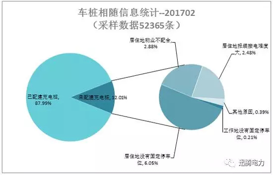 截至2017年2月,通過聯盟內成員整車企業(北汽、江淮、東風日產、長安、東風電動、奇瑞、比亞迪、上汽)采樣車樁相隨信息數據52365條,未隨車配建充電樁占比12.01%,其中由于“居住地沒有固定停車位”而未能配建充電樁的占比6.05%,由于“居住地物業不配合”而未能配建充電樁的占比2.88%,由于“居住地報裝接電難度大”而未能配建充電樁的占比2.48%,由于“工作地沒有固定停車位”而未能配建充電樁的占比0.21%,由于“其他”原因而未能配建充電樁的占比為0.39%。